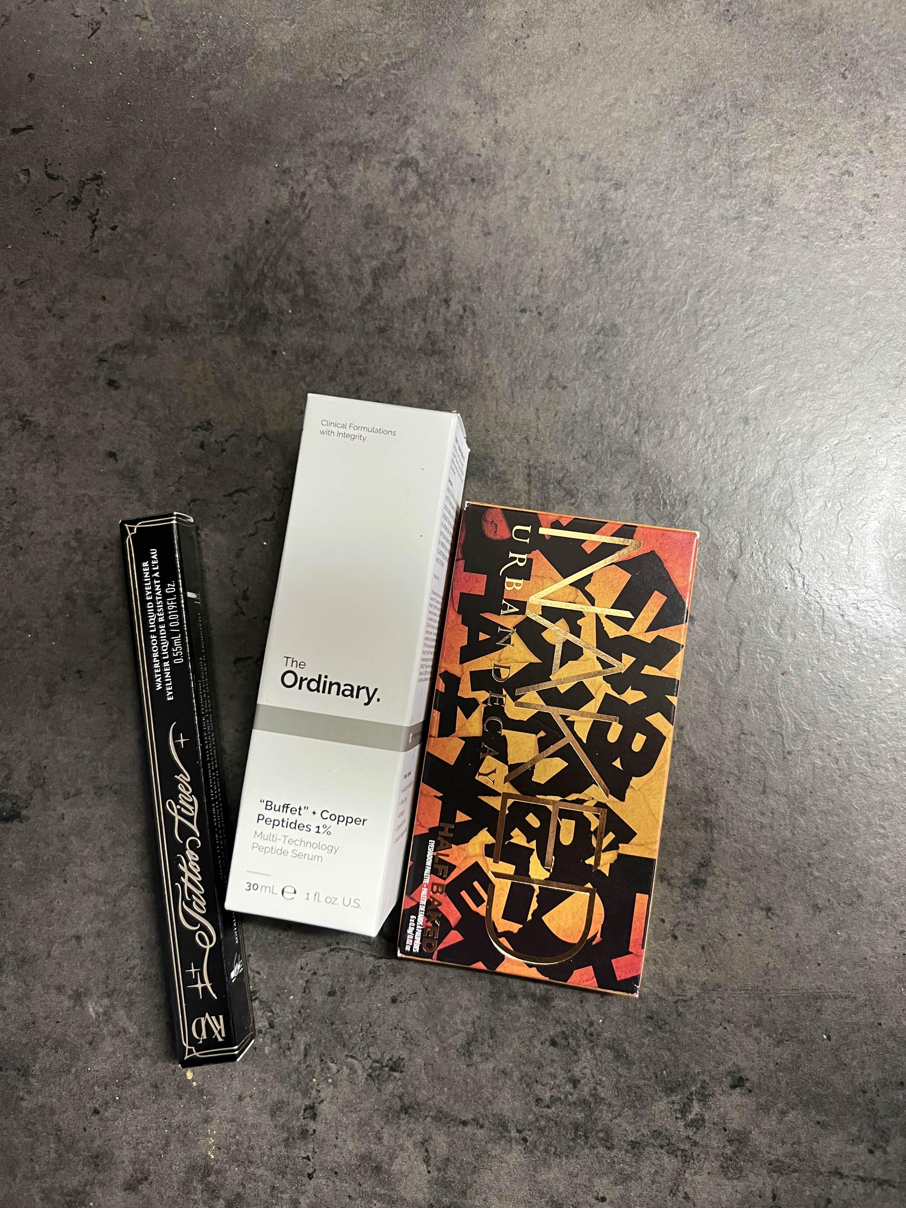 산 건 캣본디 아이라이너, 디 오더너리 세럼, 어반 디케이 미니 팔레트 하나.